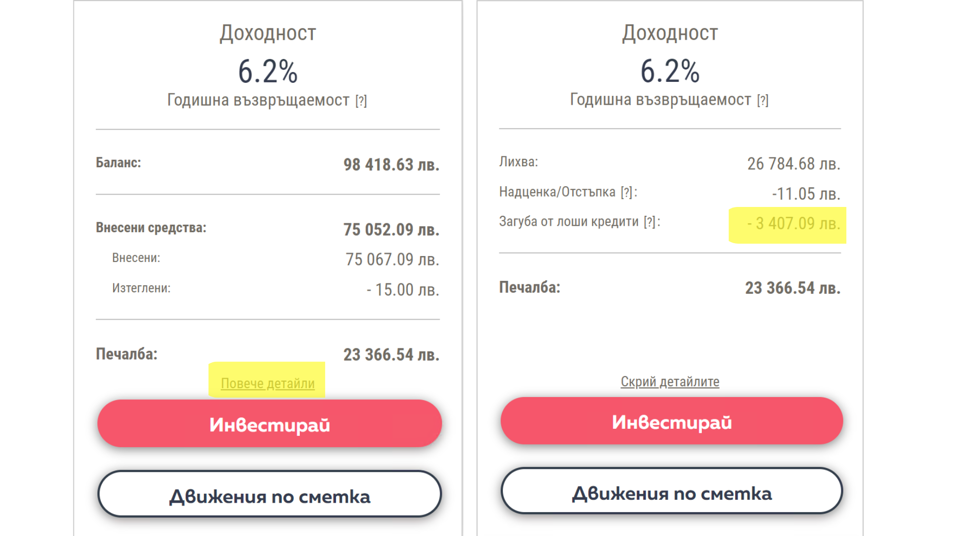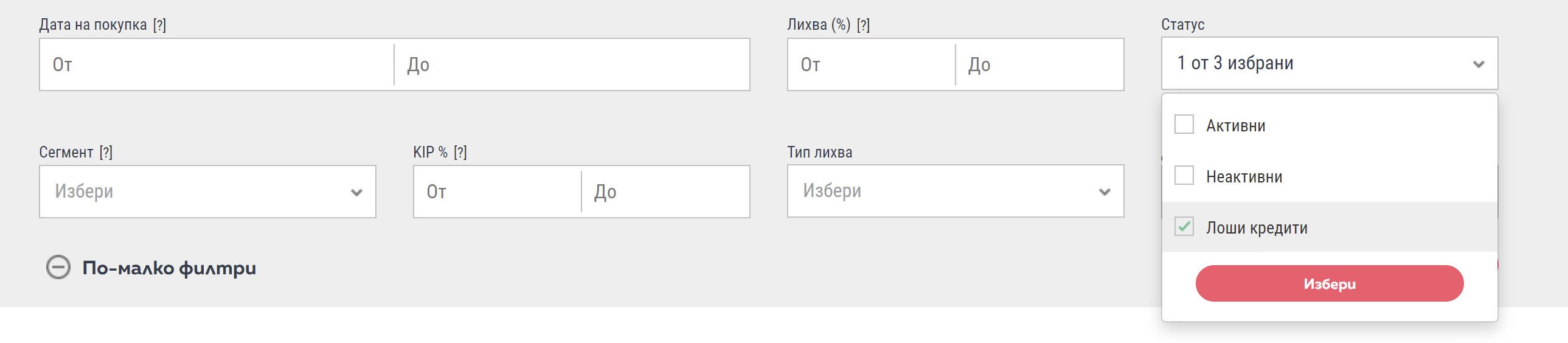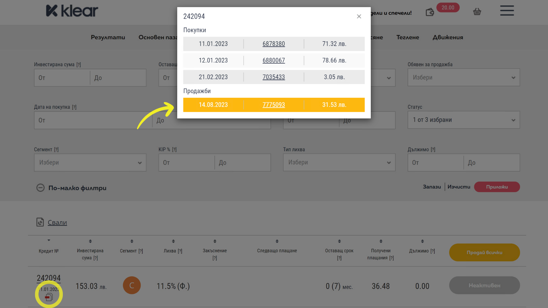 Всеки инвеститор, притежаващ част от продадения (лош) кредит, ще види в меню “Движения” получените приходи от продажбата на неговата част.