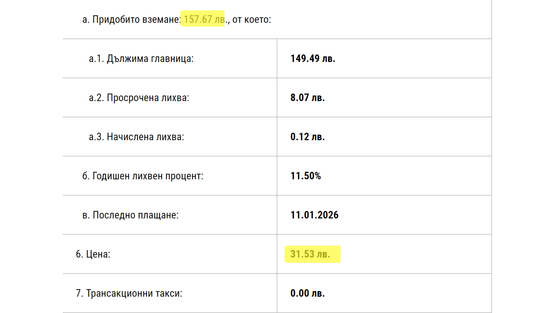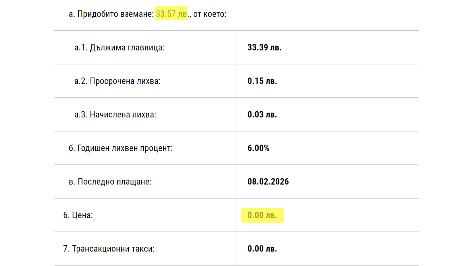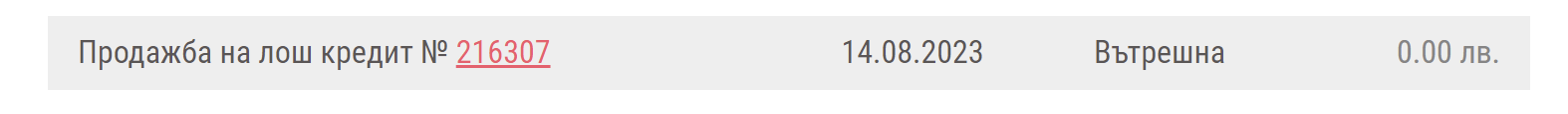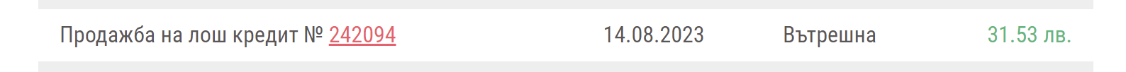 Подробностите за трансакцията могат да се намерят в секция „Портфейл“, след като се използва филтър със статус “Лоши кредити” и се отвори историята на плащане чрез иконата под номера на кредита.