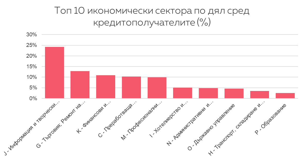 Тук сме показали първите 10 икономически сектора, в които работят нашите кредитополучатели, класифицирани според кодификацията по КИД.