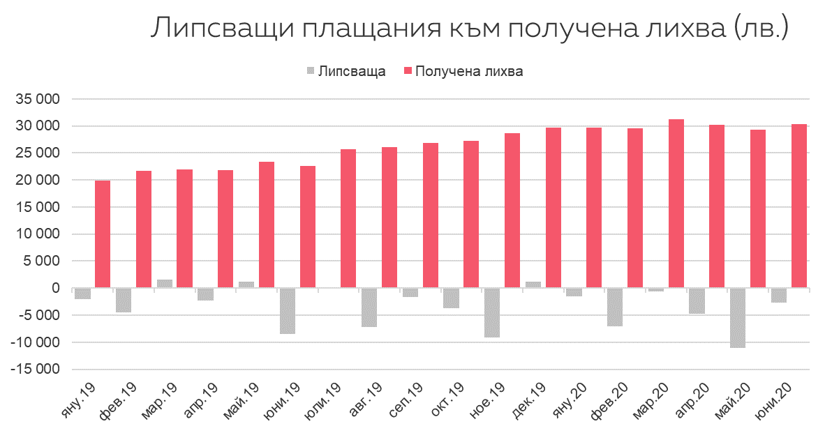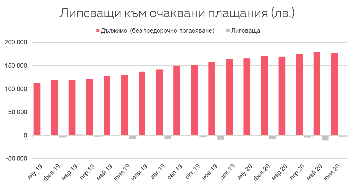 „Очаквани плащания“ е сумата, която трябва да бъде изплатена през месеца от всички кредитополучатели. „Липсващи плащания“ е това, което не сме получили или не сме отложили в края на кредита след частично плащане на кредитополучателя (вж. т. 4.).