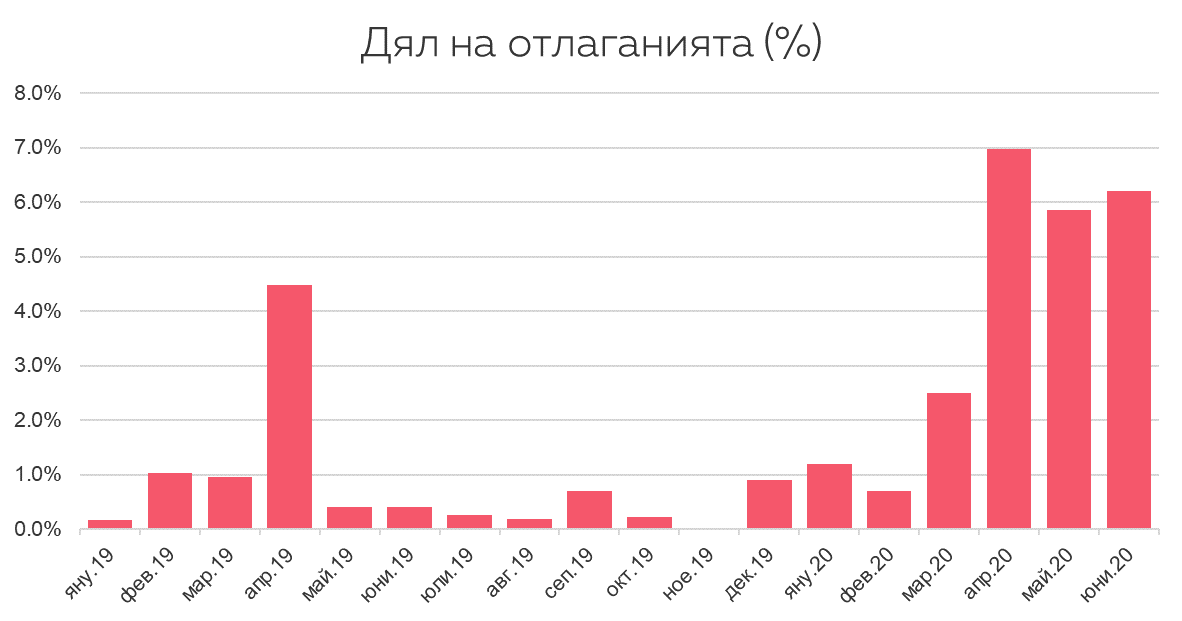 През последния период процентът на отлагане логично се увеличи, за да помогне на кредитополучателите, имащи временно намаление на приходите. Нивото обаче остава при ниска абсолютна стойност.