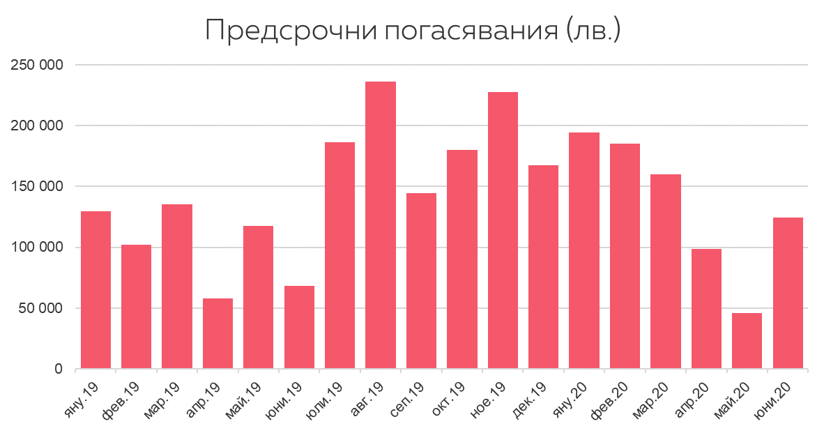 Обемът на предсрочните погасявания значително намаля. От една страна, вероятно са получени по-малко допълнителни приходи или хората предпочитат да запазят тези допълнителни получени средства, като резерв за несигурното бъдеще. Другата вероятна причина е, че по-малко кредитополучатели консолидират съществуващия си кредити с нов.