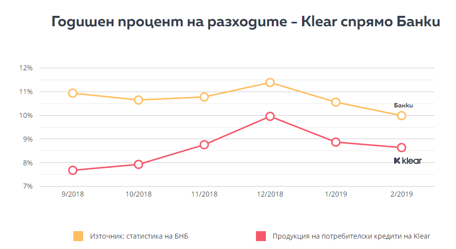 Първо, от страната на кредитополучателите Klear предлага потребителски кредити на средно по-ниски цени от банките, с повече от 15%.