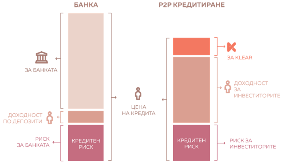 Хората – инвеститорите, които имат актив – пари, ще го споделят с други – кредитополучатели, които се нуждаят от кредит. В замяна те ще получат награда – лихвата по кредита.