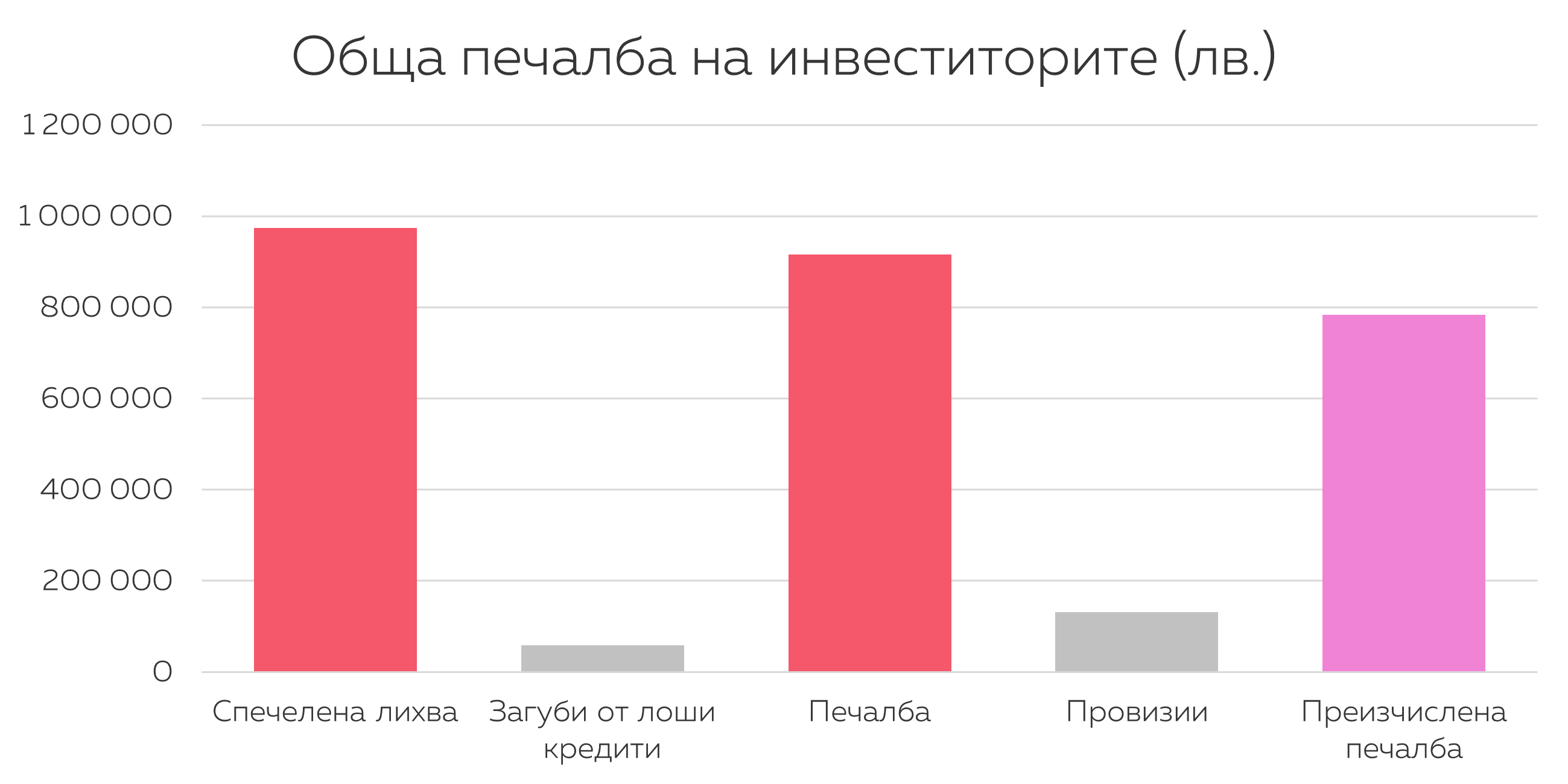 Взимаме 80% от неизплатената част от кредитите с повече от 5 вноски закъснение. Тази сума представлява провизия, която е използвана за преизчисляване на възвращаемостта за тяхното понижение. С други думи, симулираме печалбата и възвращаемостта така, сякаш сме продали тези кредити с 80% отстъпка, един по-скоро консервативен подход.