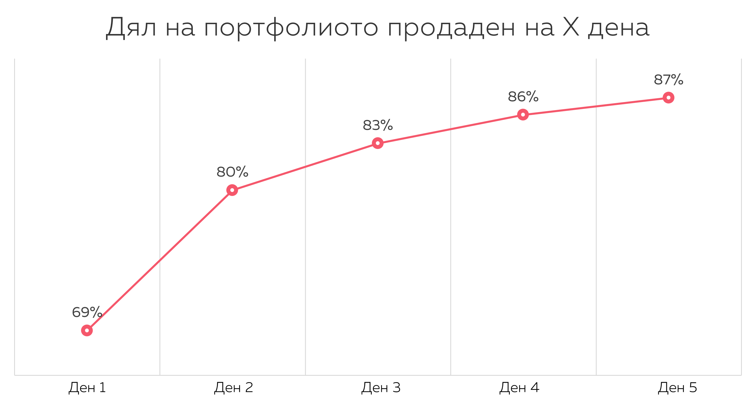 Средното време за продажба претърпя леко увеличение от последния ни отчет. Това е така, защото имахме увеличение в листването на кредити за продажба от началото на извънредното положение - средата на м. Март 2020 г. Това създаде временно забавяне, което се изчисти до края на м. Май 2020 г. Времето за продажба вече се върна на към предишните нива.