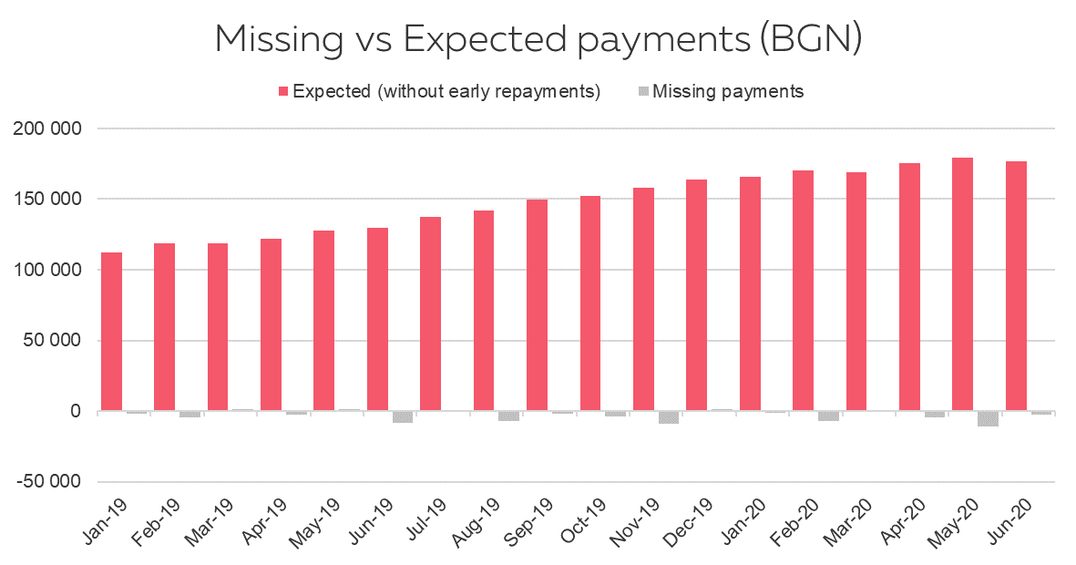 “Expected payments” is the amount due to be paid during the month by all borrowers. “Missing payments” is what we did not receive or was not postponed at the end of the loan after a partial payment of the borrower (see chapter 4.).