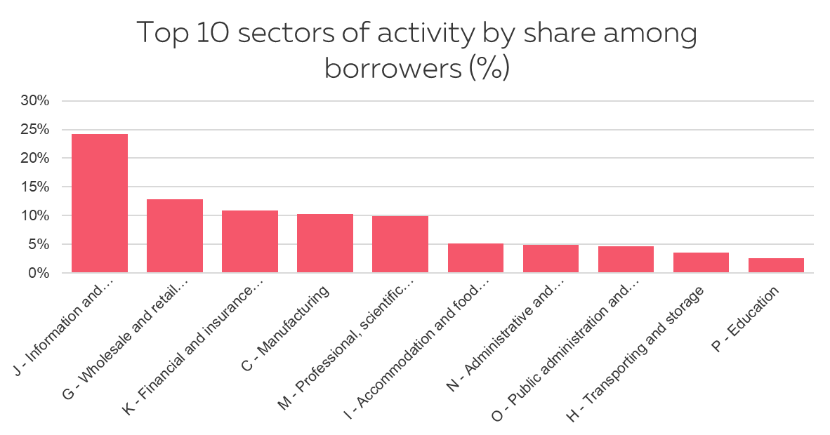 Here we show the top 10 sectors of activity in which our borrowers work, classified according to the NACE codification.